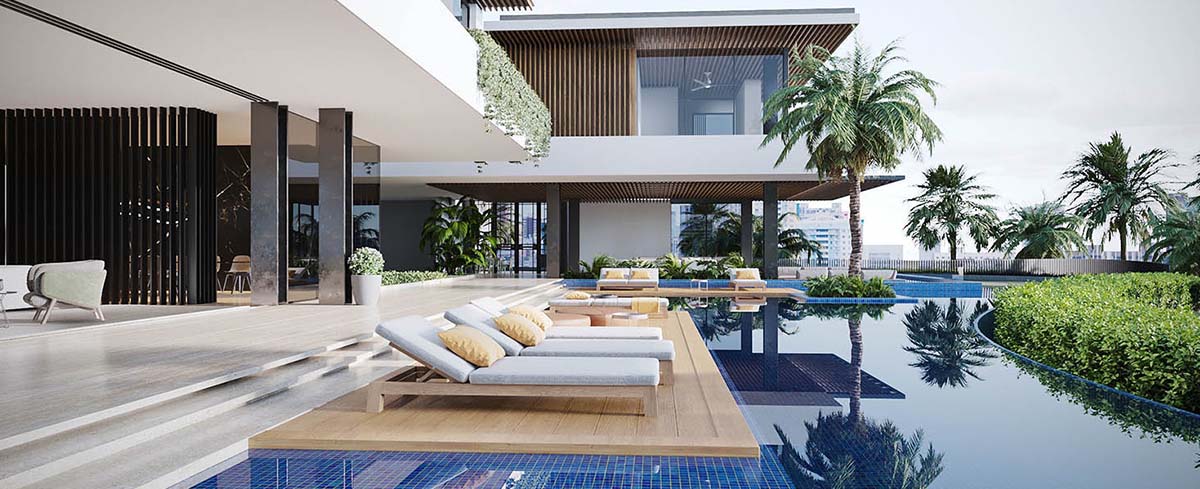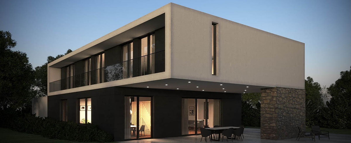 Professional rendering uses realistic materials such as wood, glass, metal, and stone to create lifelike surfaces for both interiors and building exteriors.